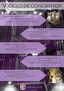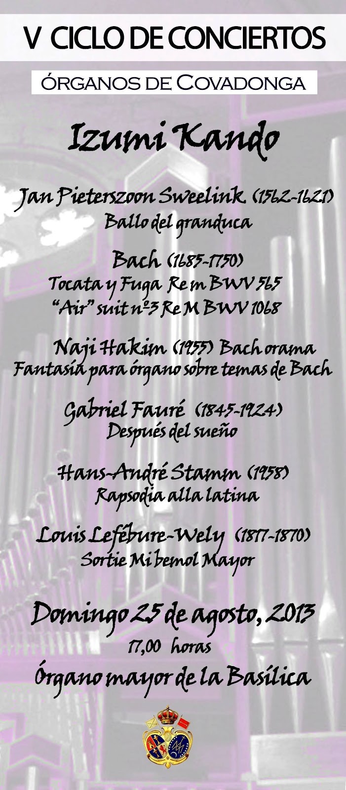 Miércoles 28 de agosto, 19:00 horas. V Ciclo de conciertos «Órganos de Covadonga», Órgano Realejo (siglo XVIII) de la Real Colegiata de San Fernando: Izumi Kando. Obras de J. P. Sweelink, Theodor Grünberger, Bernardo Storace, Félix Antonio Máximo López Crespo, J. H. Knecht, J. S. Bach y J. Kaspar (von) Kerll.