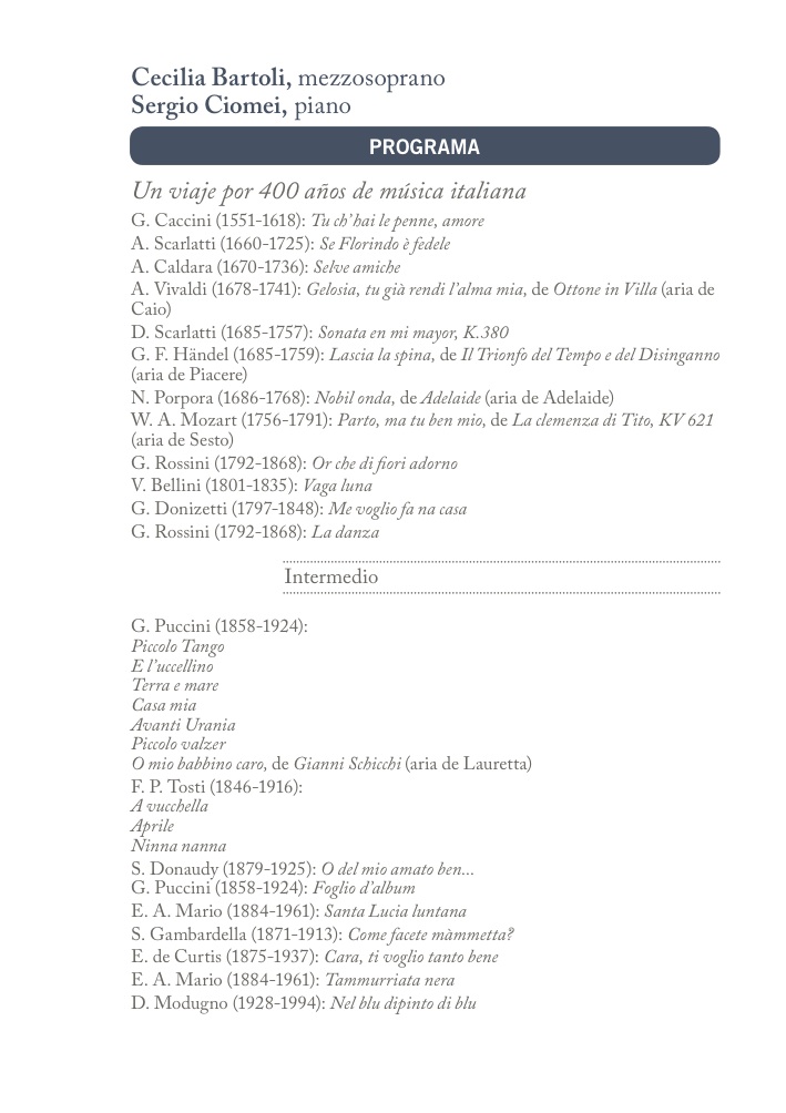Y llegaba el “non plus ultra”, pues Bellini es bel canto y la canción Vaga luna, che inargenti, de la que Arturo Reverter en sus notas al programa dice puede “considerarse una suerte de precedente en miniatura de la cavatina Casta diva de Norma” en la voz de Angela Gheorghiu resultó un aria de calado, enorme, parando el tiempo en la palabra o sílaba exacta, el ornamento ideal no escrito, la magia de la noche granadina donde el piano remataba el bordado áureo más que plateado de la soprano. Resulta maravilloso escuchar estas páginas tan conocidas cuando se interpretan como las canta “la última diva”.