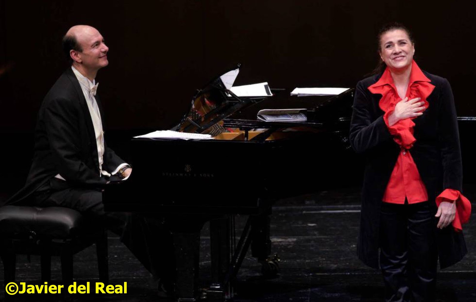 Un recital resulta más exigente que cualquier ópera precisamente por esa carga dramática que conlleva cada obra elegida, y la primera parte arrancó con varias páginas que todo estudiante de cante ha transitado, y los llamados pianistas repertoristas aún más. Qué maravilla cuando las canta una maestra como Angela Gheorghiu y el piano de Jeff Cohen, veterano en estos menesteres sabiendo dónde respirar, esperar, incluso saltarse algún compás porque enganchará sin problemas con la artista, y eso es la soprano rumana.