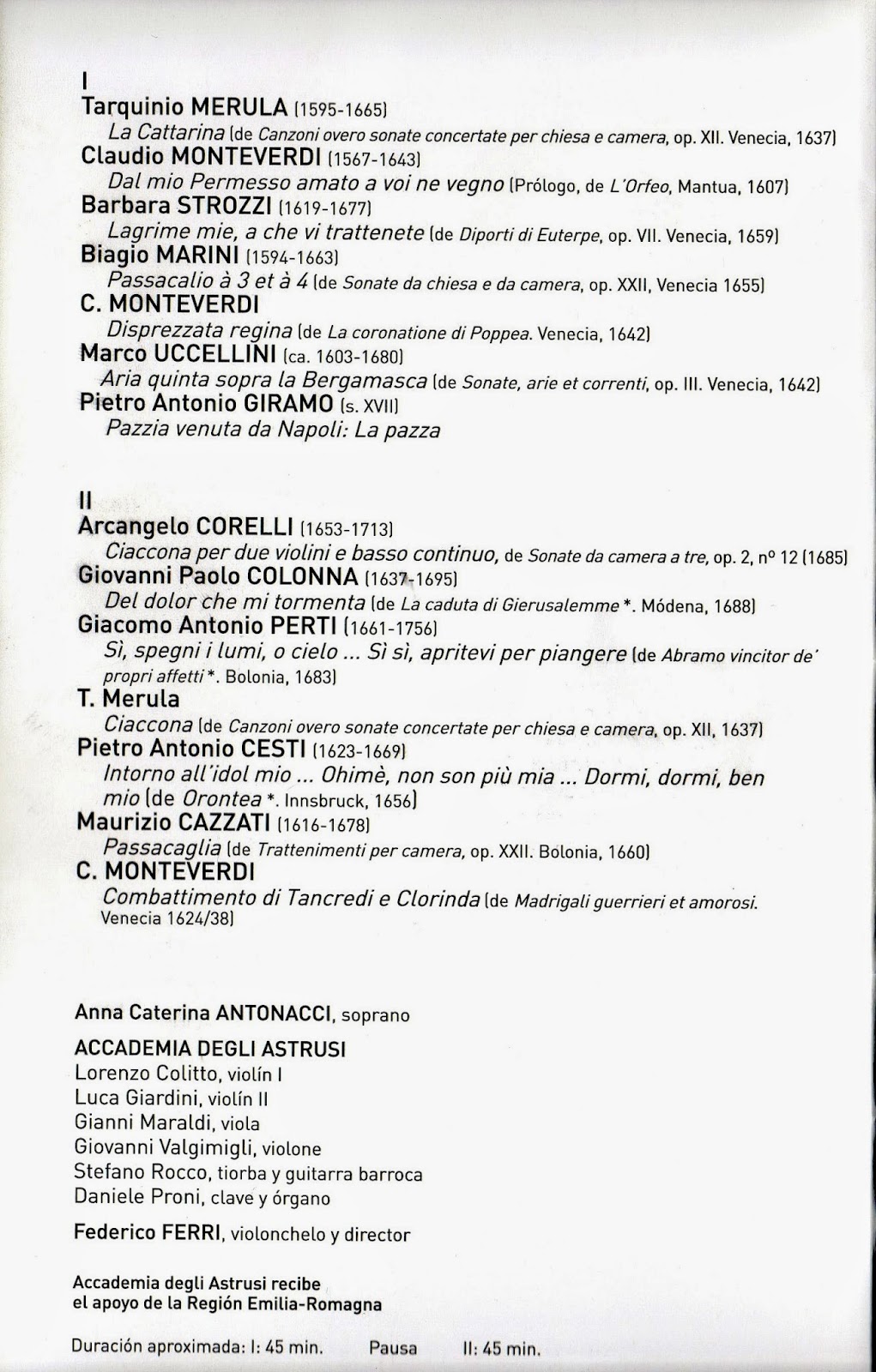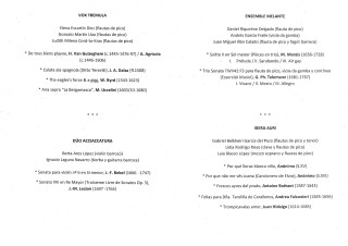 Comenzaron con el anónimo del siglo XV Por qué llorax blanca niña en la voz femenina con el clave casi laúd y la flauta de perfecta ambientación sefardí, continuando con Por que não me vês Joana del Cancionero de Elvas otro anónimo del XVI alternando las flautas y voces, mejor la mezzo que el tenor pero ambos con naturalidad, fraseando después las flautas como el texto más el siempre presente y seguro clave, aparcando momentáneamente las flautas para cantarnos Frescos ayres del pradode Antoine Boësset (1587-1643), antes de las dos conocidas obras para el final, las instrumentales y virtuosas Folias para Dña. Tarolilla de Carallenosde Andrea Falconieri (1585-1656) y Trompicavalas amor de Juan Hidalgo de Polanco (1614-1685) con Laia Blasco cantando junto a la flauta de Gabriel y el clave de Lidia en una versión que madurará con ellos porque hay tantas versiones que todavía será inalcanzable la propia con este trío joven.