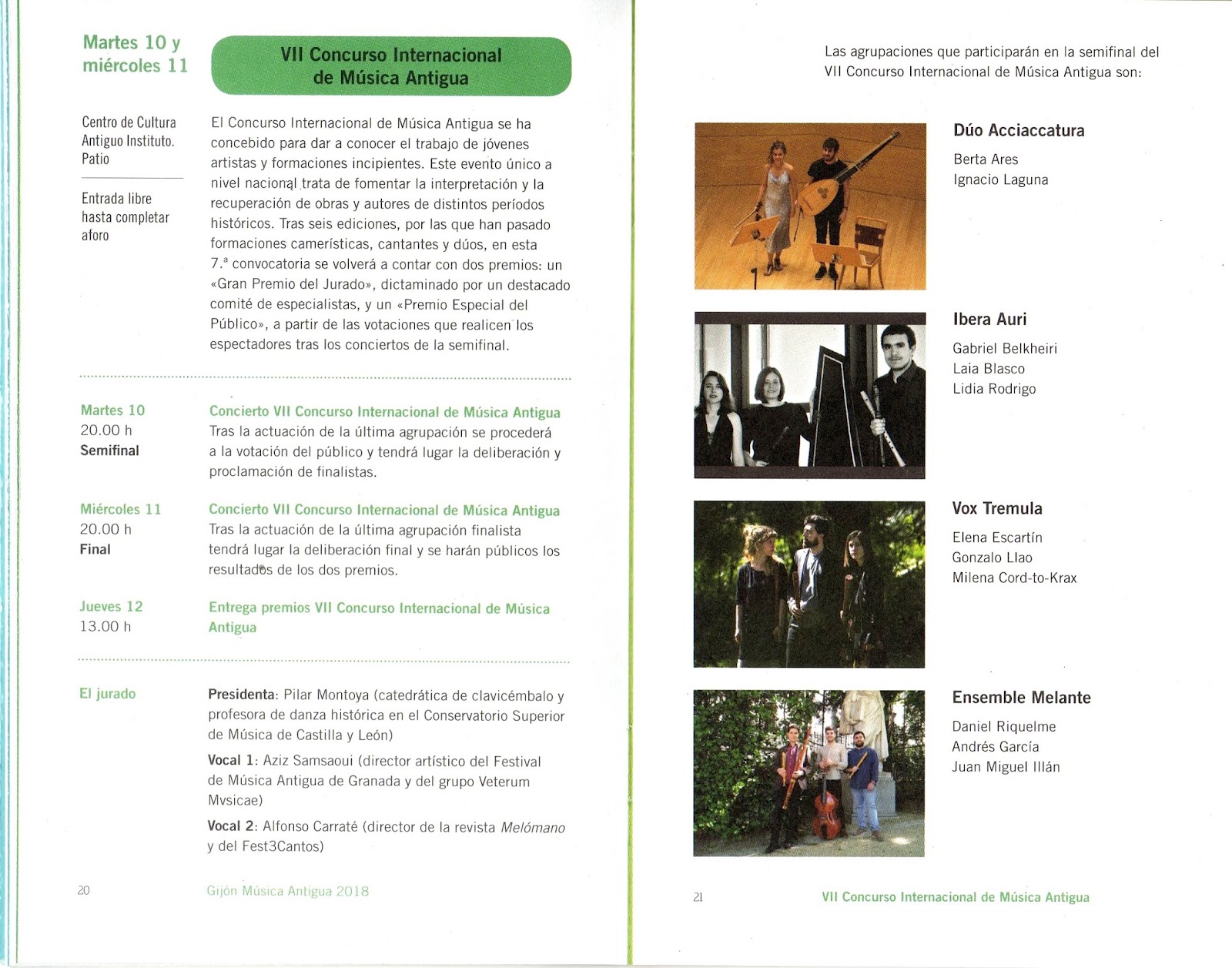 Dentro del XXI Festival de Música Antigua de Gijón se celebra este concurso internacional que llega ya a su séptima edición, pasando a la penúltima ronda cuatro grupos con predominio de flautas y algunas propuestas interesantes no ya por el repertorio donde abundó el Renacimiento, sino por las formaciones que actuaron por sorteo en el orden siguiente que paso a comentar.